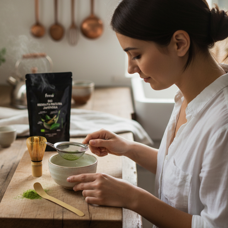 Dla uzyskania delikatniejszego smaku i przygotowania matchy latte możesz zastąpić część wody spienionym mlekiem lub napojem roślinnym.