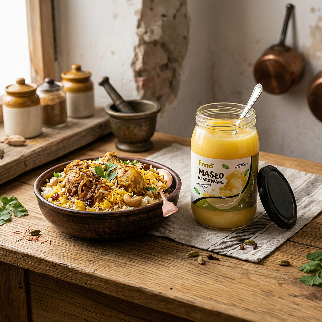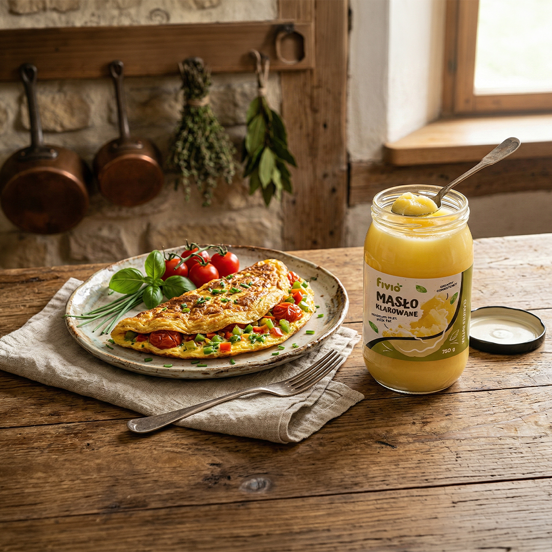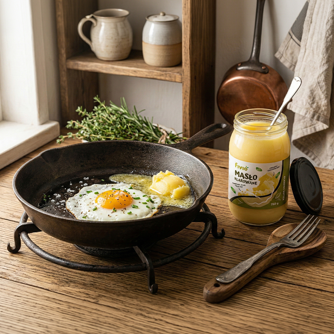 Masło klarowane fivio to czysty tłuszcz mleczny o wysokiej zawartości tłuszczu (minimum 99,6%), przeznaczony do smażenia, pieczenia i gotowania w wysokich temperaturach. Dzięki procesowi klarowania pozbawione jest wody i części stałych mleka, co zapewnia wysoką temperaturę dymienia oraz stabilność podczas obróbki termicznej. Produkt idealny dla osób na diecie keto i Low Carb.