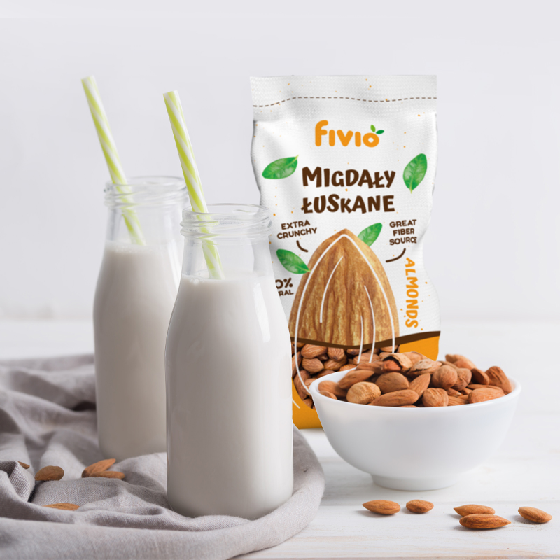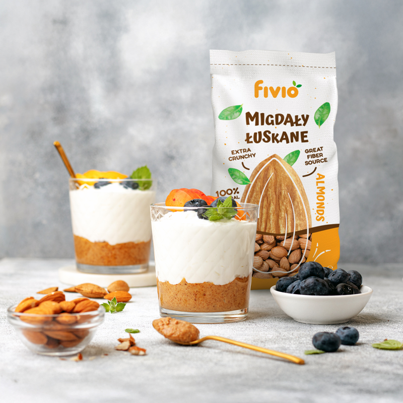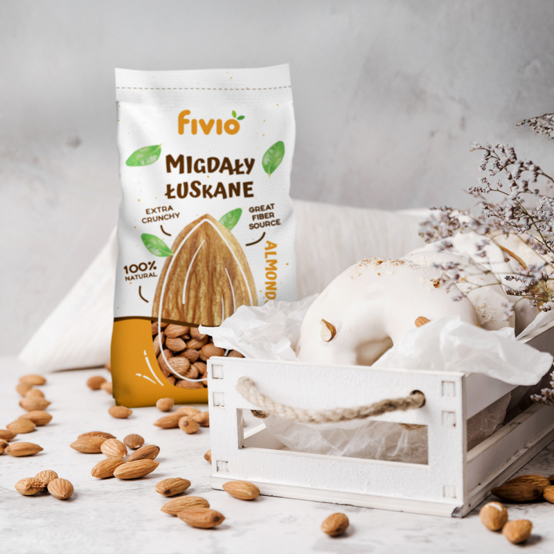 Nasze opakowanie migdałów łuskanych fivio zużywa o 62% mniej folii niż standardowe opakowania w branży spożywczej. Kupując migdały fivio, wspierasz ekologiczne rozwiązania i dbasz o naszą planetę.